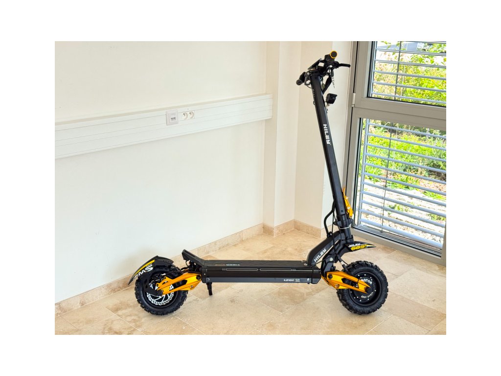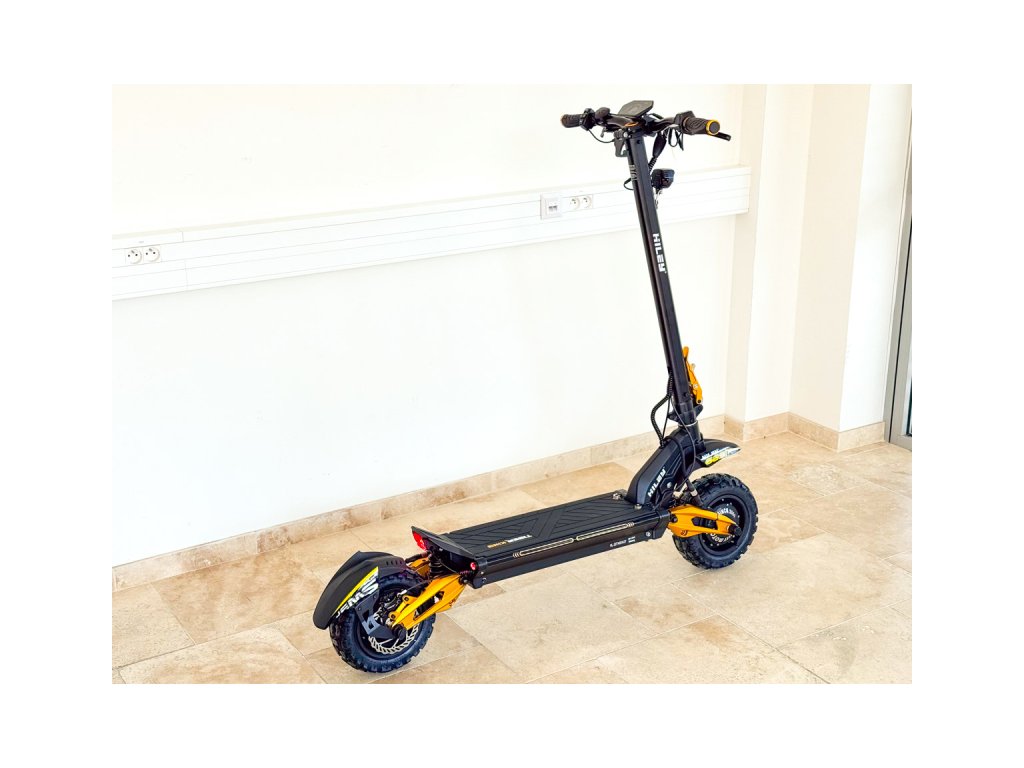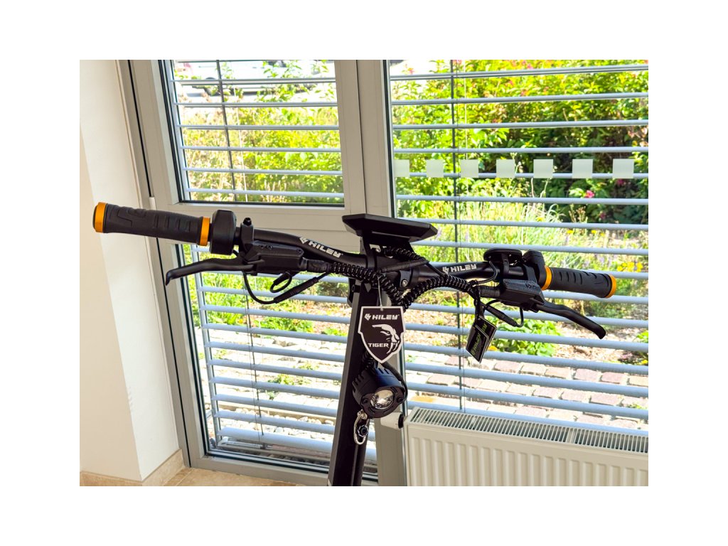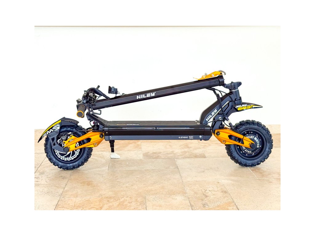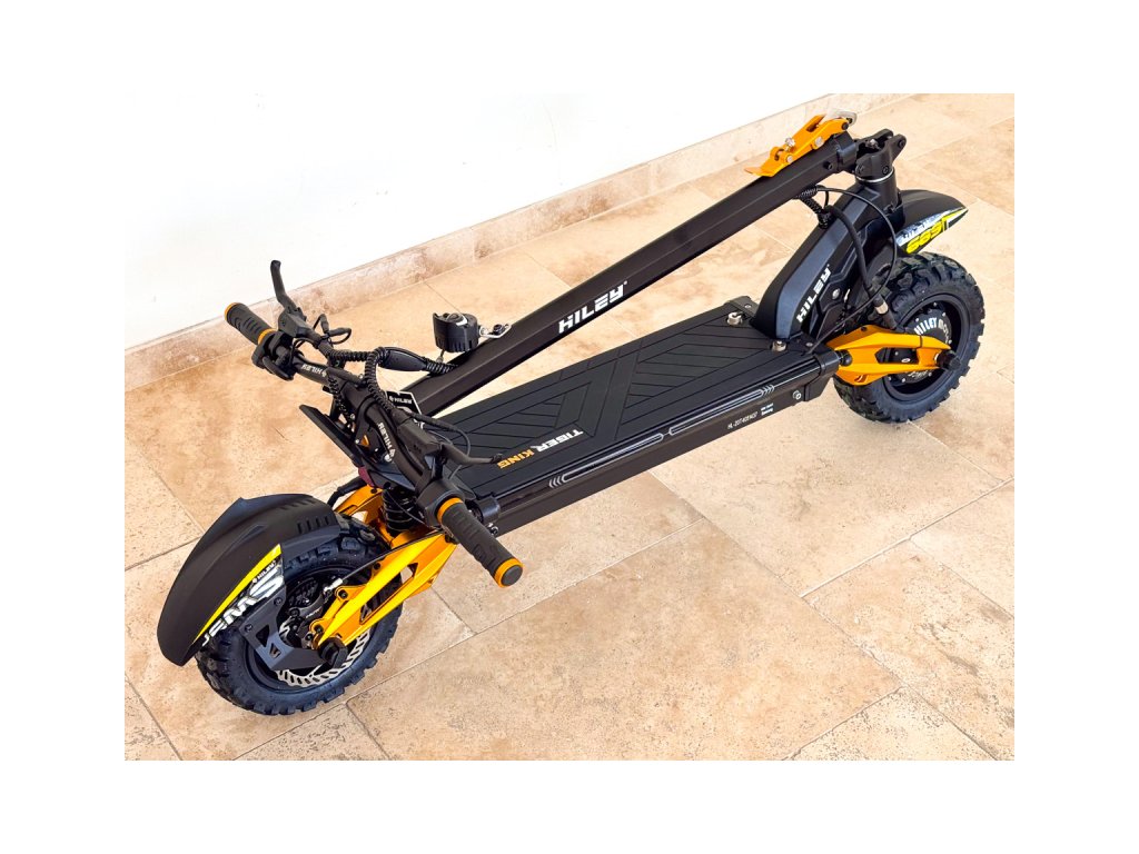 Nová prémiová kvalitní skládací elektrokoloběžka Hiley TIGER MAX, duální motor 3000W (max. výkon až 5000W), baterie SAMSUNG 60/30Ah, dojezd až 100 km. Maximální rychlost 75 km/hod., "C" hydraulické nastavitelné odpružení v předu i vzadu, LED boční osvětlení, celohliníkové tělo, multifunkční TFT displej, brzy NUTT, NFC, 11" kola.