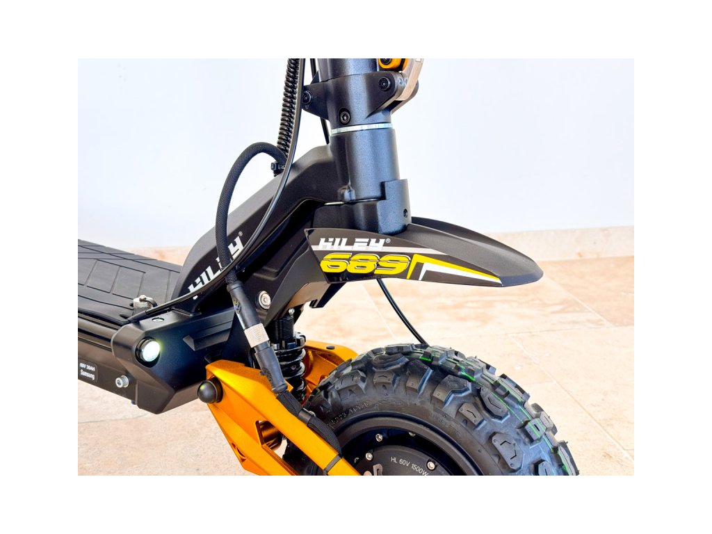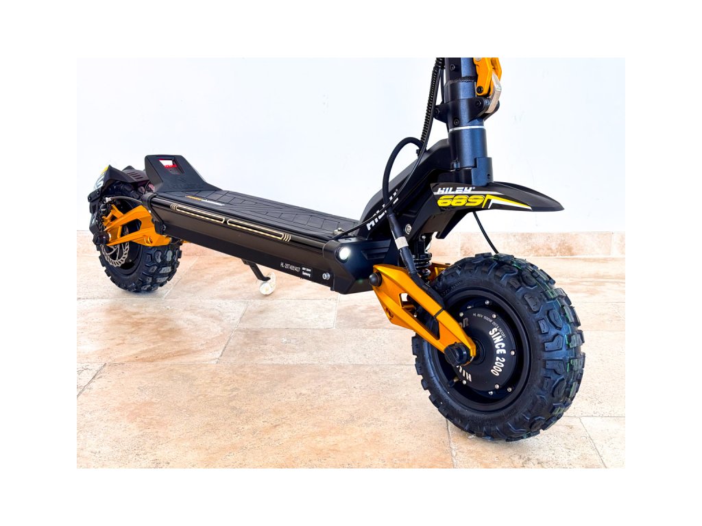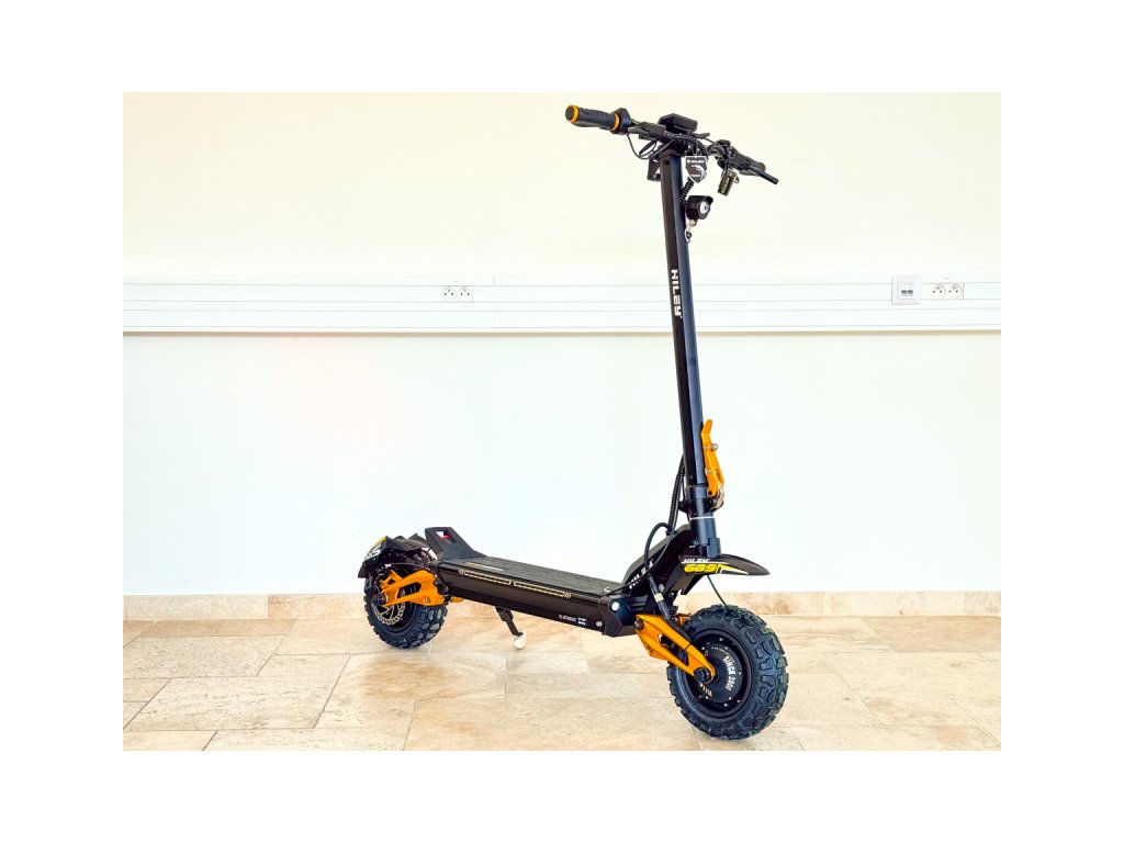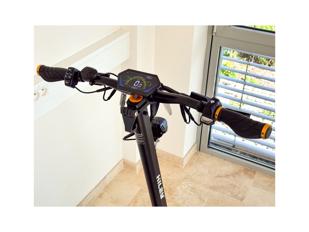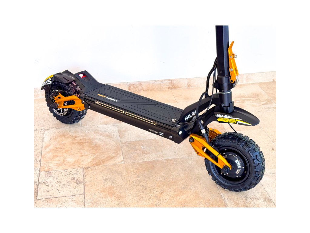 Nová prémiová kvalitní skládací elektrokoloběžka Hiley TIGER MAX, duální motor 3000W (max. výkon až 5000W), baterie SAMSUNG 60/30Ah, dojezd až 100 km. Maximální rychlost 75 km/hod., "C" hydraulické nastavitelné odpružení v předu i vzadu, LED boční osvětlení, celohliníkové tělo, multifunkční TFT displej, brzy NUTT, NFC, 11" kola.