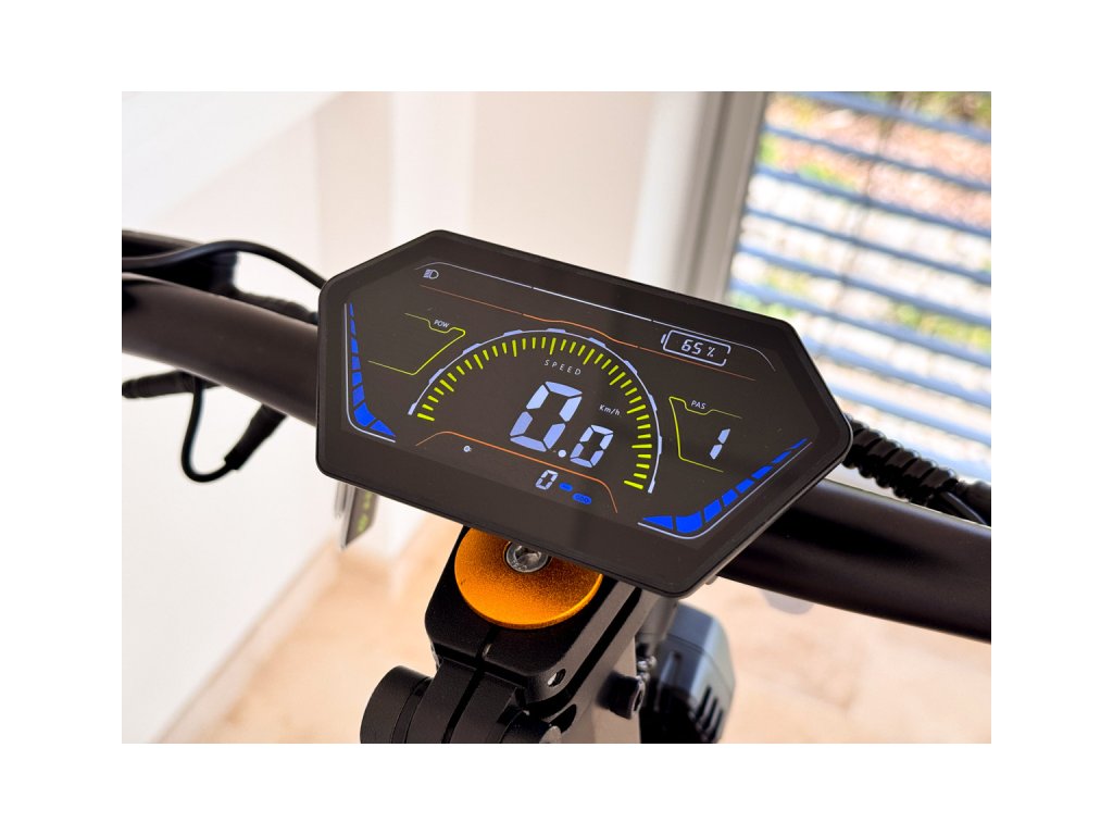 Na velkém TFT displeji se přehledně zobrazuje vše potřebné jako rychlost, ujeté kilometry, kontrolky světel, stav nabití akumulátoru, teplota jednotlivých motorů, venkovní teplota, aktuální výkon apod.